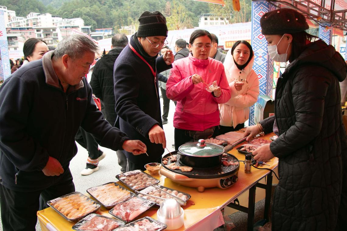 在农特产品展销上,嘉宾体验资源美食。