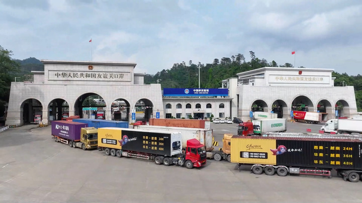 距离靖西市200多公里的友谊关口岸是中国面向东盟最大的陆路口岸之一。每天开关后,满载跨境货物的货车在口岸有序排队,等待通关。