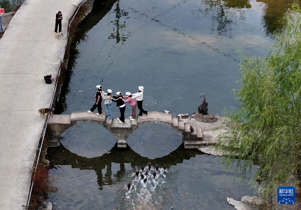 在柳州市柳江区进德镇乐山村,游客在小桥上拍照(2025年11月1日摄,无人机照片)。