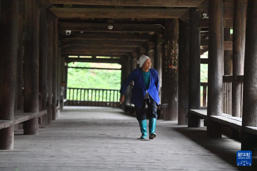 在三江侗族自治县独峒镇岜团村,老人在风雨桥上经过(2025年11月5日摄)。
