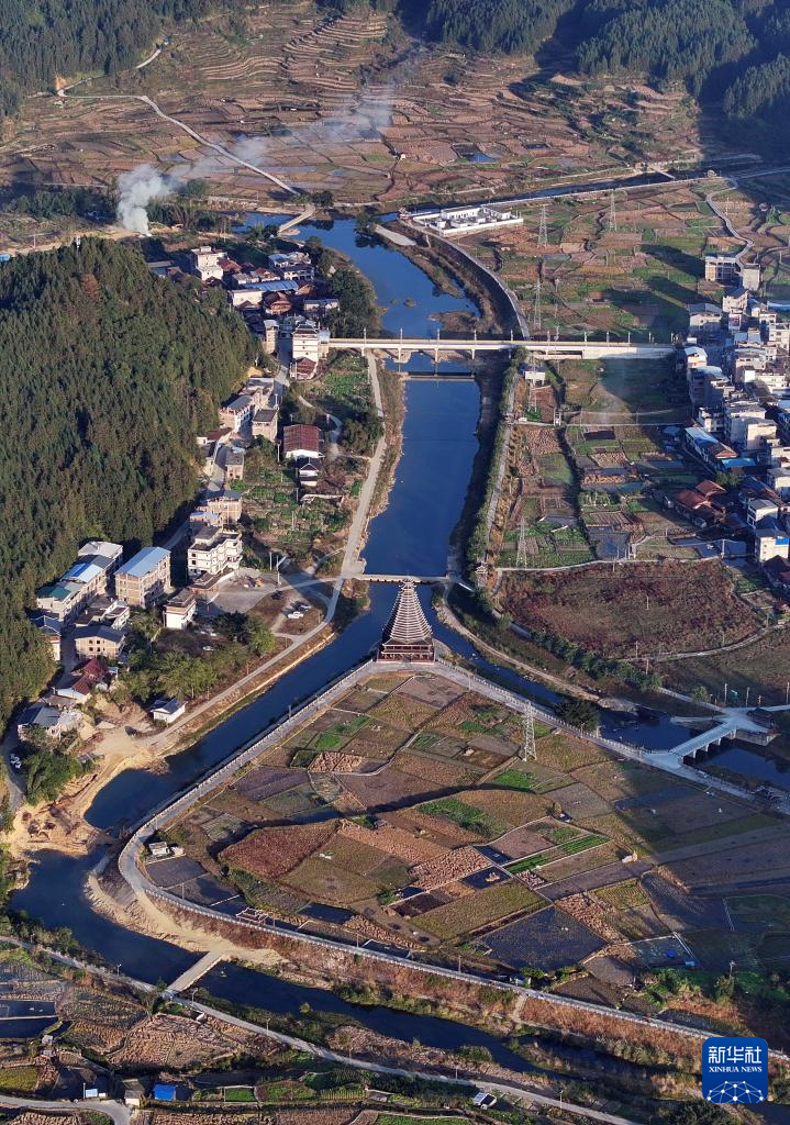 在融水苗族自治县洞头镇洞头村,多座小桥横跨在穿村而过的小河上(2025年11月25日摄,无人机照片)。
