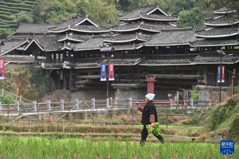 在三江侗族自治县独峒镇岜团村,村民在风雨桥附近劳作(2025年11月5日摄)。