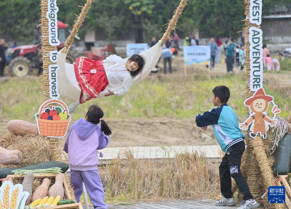 在柳州市柳江区进德镇泗浪村“刷子摄影基地”,小朋友在田边荡秋千(11月1日摄)。