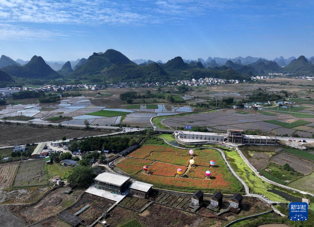 游客在柳州市柳江区百朋镇百朋村“酒壶山人家”游玩(11月23日摄,无人机照片)。