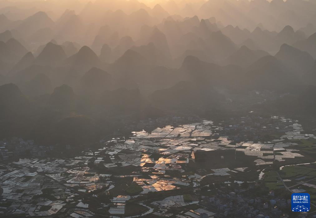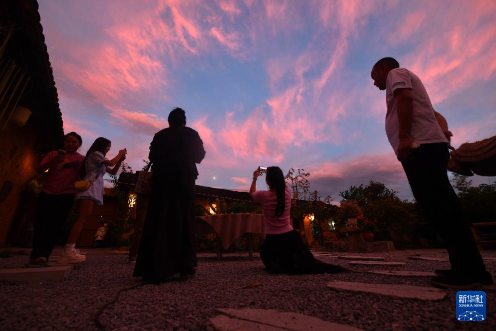 游客在柳州市柳江区拉堡镇基隆村“蔚茗坞”拍摄夕阳美景(10月5日摄)。