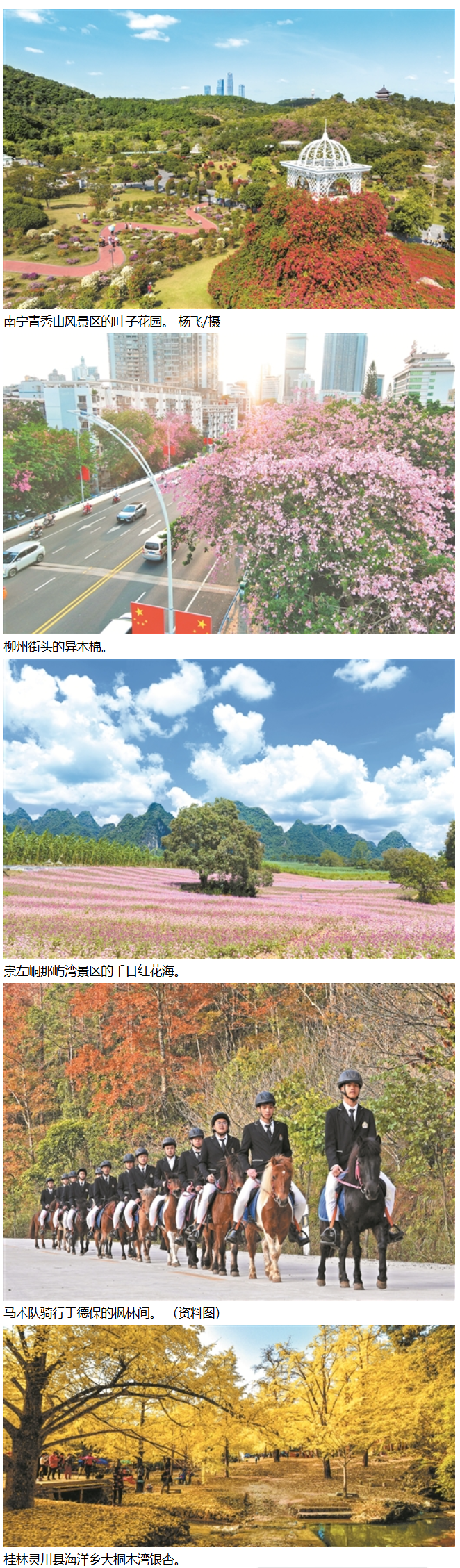 当北国已是银装素裹,八桂大地依然绚烂多彩。争奇斗艳的花卉缀满大街小巷,金黄的银杏铺满古村石阶,火红的枫叶染遍山野,勾勒出一幅冬如春华的斑斓画卷。