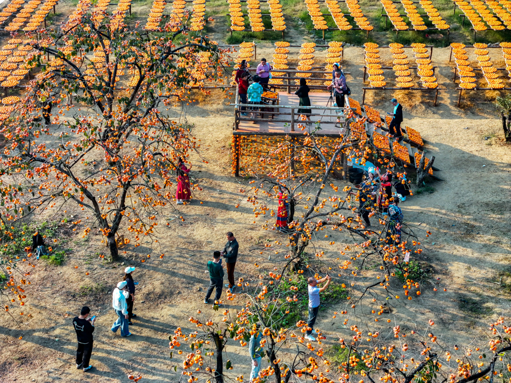 以上图片:2025年12月8日,在广西桂林市恭城瑶族自治县莲花镇红岩村,游客在月柿园里游玩。(无人机照片)CICPHOTO/黎豪图 摄