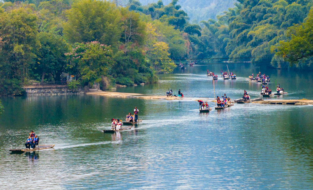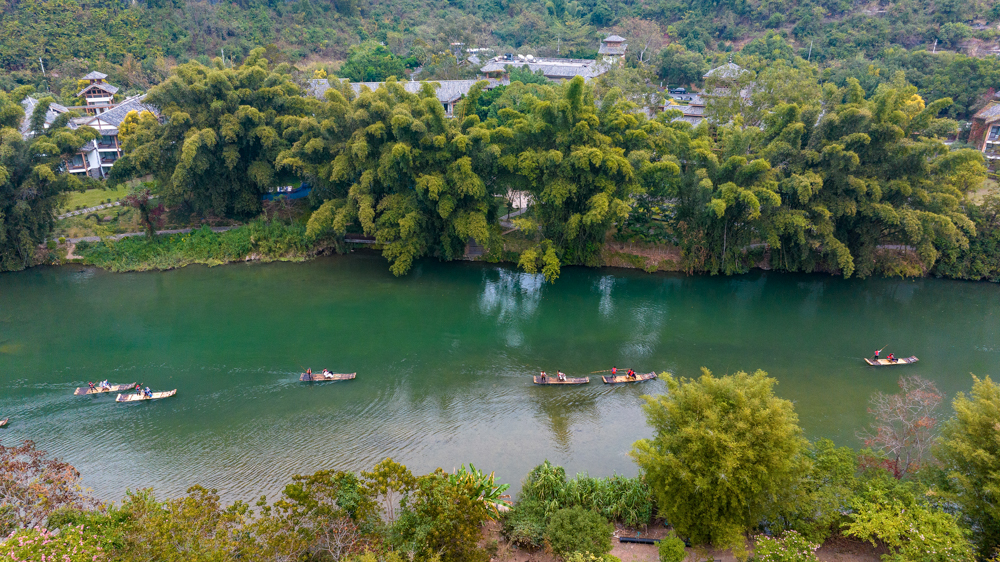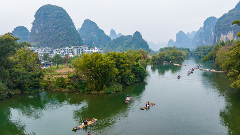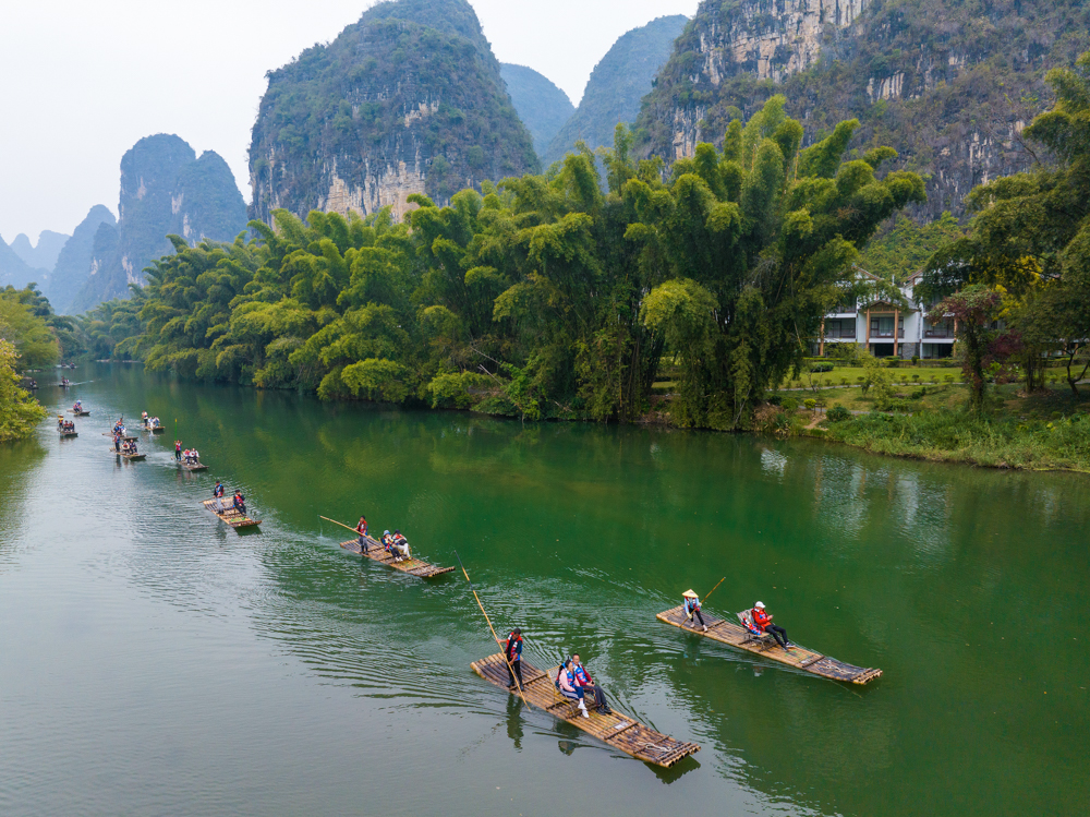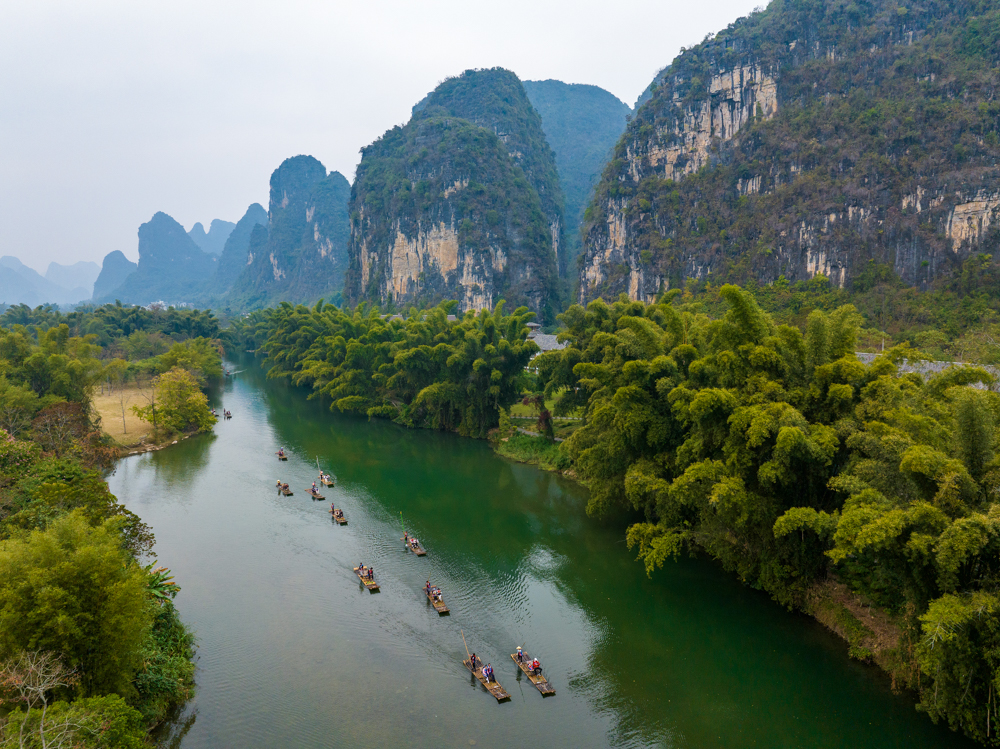 冬日时节,广西桂林市阳朔县遇龙河景区峰峦叠翠,碧水蜿蜒,如诗如画的景致吸引游客赏景游玩。