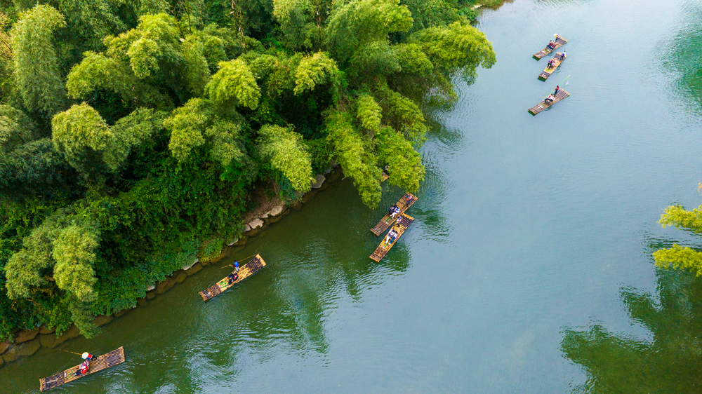 以上图片:2025年12月10日,游客乘坐竹筏在广西桂林市阳朔县遇龙河赏景游玩。(无人机照片)CICPHOTO/何华文 摄