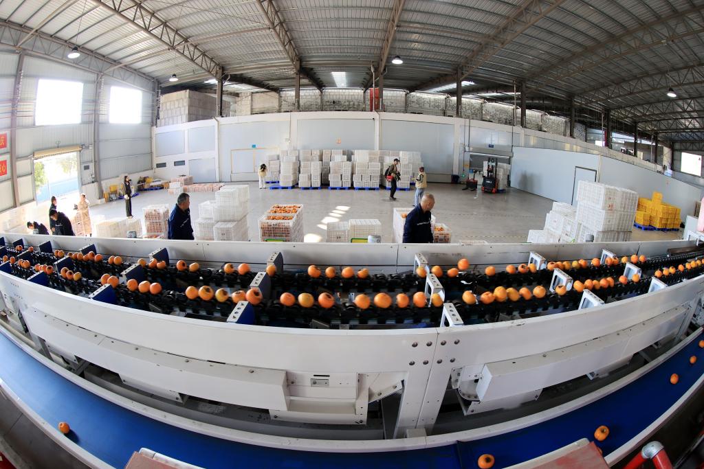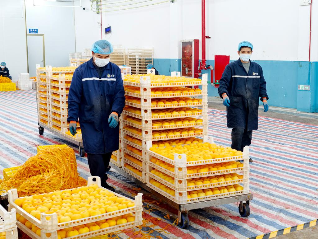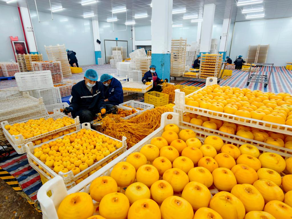 ↑2025年12月14日,在广西桂林市平乐县一家柿子生产企业,工人在生产线上作业。CICPHOTO/谭克兴 摄