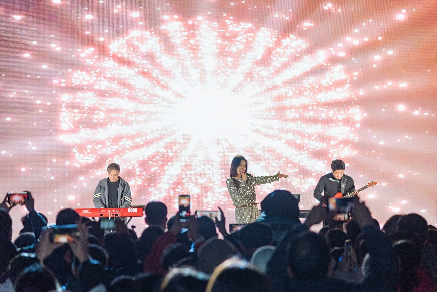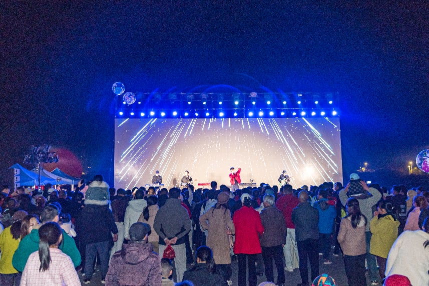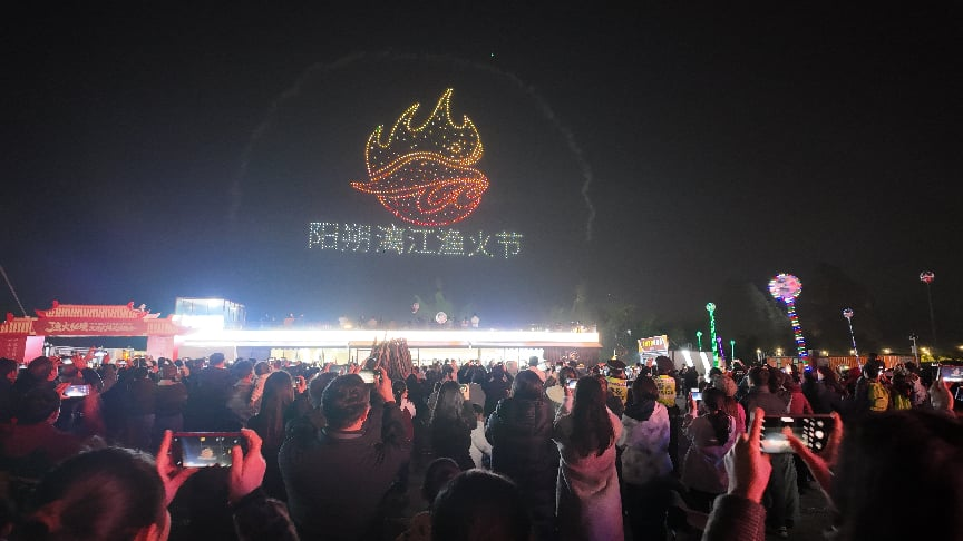 在主会场阳朔湾码头,千架无人机腾空而起,在夜空中依次变幻出“阳朔漓江渔火节”等12幅动态画面,吸引游客驻足拍摄。主舞台上,流行歌手与摇滚乐队轮番演唱,啤酒竞速赛气氛热烈,台上台下热情互动,现场化作一片欢乐的海洋。