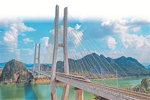动车组列车奔驰在南珠高铁南玉段百合郁江铁路大桥上。 施少明/摄