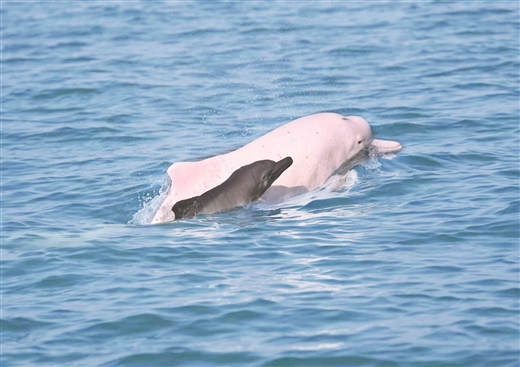 “快看!粉色的海豚!”近日,在钦州三娘湾海域,几头被誉为“海上大熊猫”的中华白海豚跃出碧波,溅起晶莹浪花,引得船上游客阵阵欢呼。
