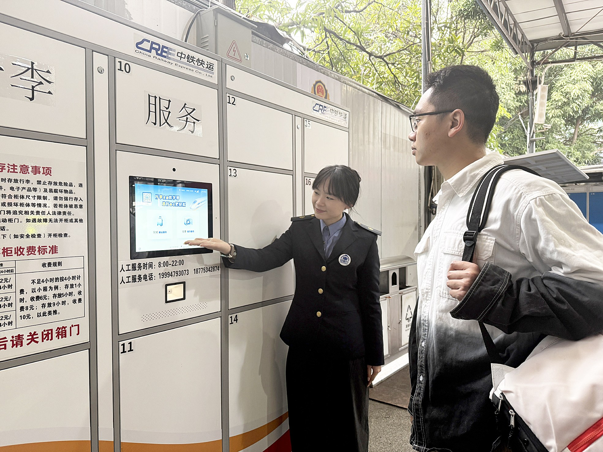 在南宁站出站口处,工作人员引导旅客使用“轻装行”服务。汪璐璐 摄