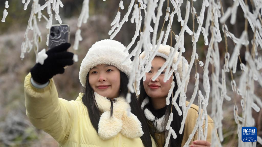 1月21日,在三江侗族自治县侗天湖茶产业示范区,两名侗族姑娘在冰凌间拍照留念。