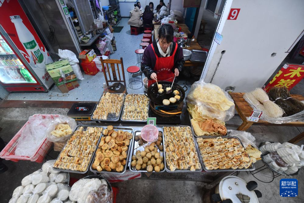 人们在柳州市柳江区成团镇集市吃早餐(1月28日摄)。