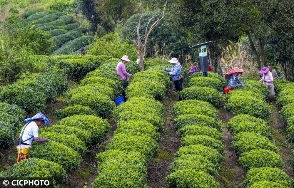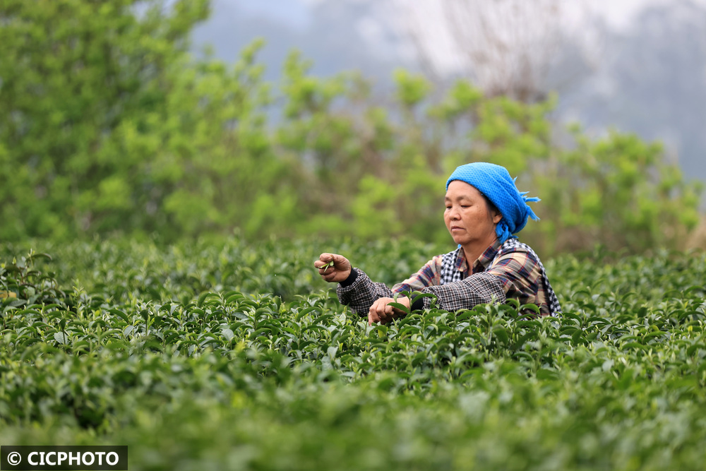 2026年3月15日,茶农在广西柳城县伏虎华侨农场茶园采茶。CICPHOTO/谭克兴 摄