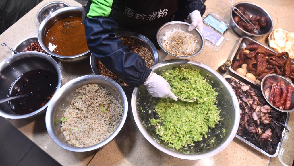 在柳州市融安县融州路惠玲滤粉店,工作人员在给滤粉配佐料(3月3日摄)。
