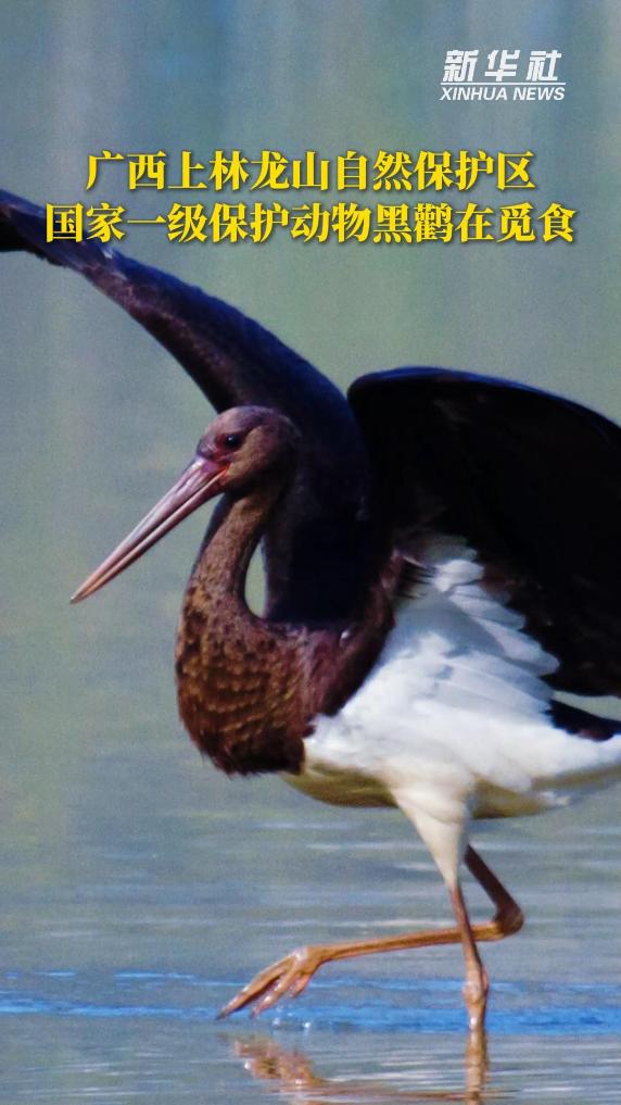 广西上林龙山自然保护区国家一级保护动物黑鹳在觅食